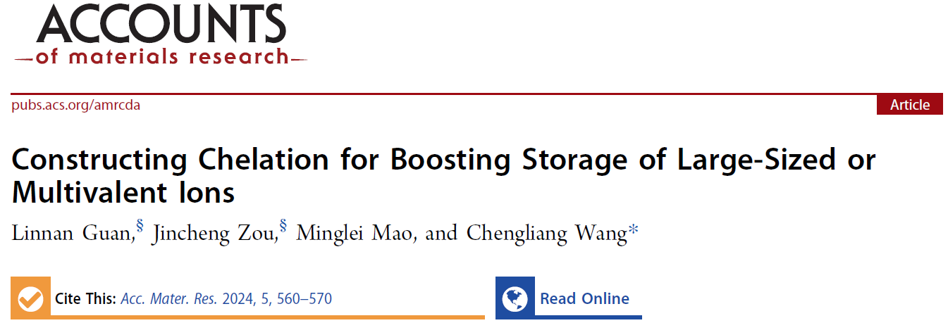 通过构筑高分子异构体,揭示了邻位官能团对于离子的螯合作用,并利用邻位官能团实现了储能容量的大幅提升,相关工作以“Constructing Structural Isomers to Reveal and Enhance Lithium Storage in a Conducting Polymer”为题发表在《先进能源材料》期刊上(Adv. Energy Mater. 2024, 13, 2304210)。戴慧超、陈远、高彦博和龚磊为论文共同第一作者,王成亮教授为通讯作者。基于相关系列成果(Angew. Chem. Int. Ed. 2022, 61, e202207221;Angew. Chem. Int. Ed. 2022, 61, e202116289;Adv. Funct. Mater. 2023, 33, 2303678;Chem. Eng. J. 2023, 460, 141703;Energy Environ. Sci. 2024, 17, 6360等),团队受邀在《材料研究述评》上以“Constructing Chelation for Boosting Storage of Large-Sized or Multivalent Ions”为题发表评述文章,揭示了构筑螯合作用对于促进离子存储的重要性(Acc. Mater. Res. 2024, 5, 560)。冠林南、邹进成为论文共同第一作者。王成亮教授为通讯作者。