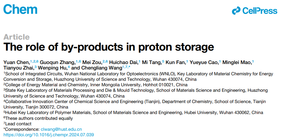 通过构筑低聚体可以更容易地揭示储能机制,团队发现了质子存储的副产物对于电荷存储的重要作用。并进而提出了一种通过添加人工副产物将导电聚合物及其低聚物的存储机制从较差的阴离子存储转变为可逆质子存储的方法,大幅提高了导电聚合物的容量、倍率和循环性能。相关成果以“The role of by-products in proton storage”为题发表在Cell出版社《化学》期刊上(Chem 2024, DOI: 10.1016/j.chempr.2024.07.039)。论文通讯作者是王成亮教授,共同第一作者是陈远、张国群和邹梅。该系列工作得到了国家自然科学基金和湖北省创新群体等项目的支持。