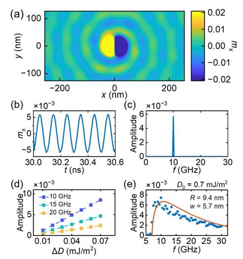 为解决上述问题,研究团队提出了一种基于铁电/铁磁异质结的压控自旋波发生器。该发生器将铁磁层中的斯格明子作为自旋波激发源,在器件上下两端施加射频电压来调控DMI,从而激发自旋波。斯格明子是一种拓扑保护的磁性准粒子,其尺寸可以低至10 nm,并具有独特的拓扑特性。团队首先对斯格明子中的DMI有效场和力矩进行了分析,推导出它们的空间分布公式。理论分析表明,DMI力矩集中分布在斯格明子的半径附近。因此,当DMI系数变化时,斯格明子边界会作为激发源驱动畴结构移动,从而激发出自旋波。研究团队使用6 GHz和10 GHz两个频率激励斯格明子,分别得到了斯格明子的呼吸模式和自旋波模式。最后,通过微磁学模拟验证了该结构中自旋波激发的理论预测,得到了高质量的自旋波波形和幅频响应,激发频率可达30 GHz以上。