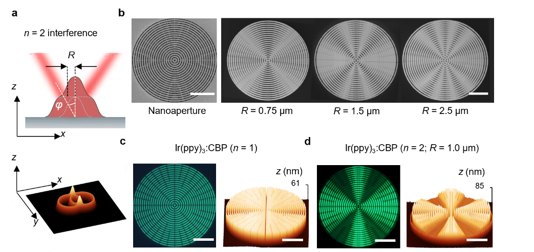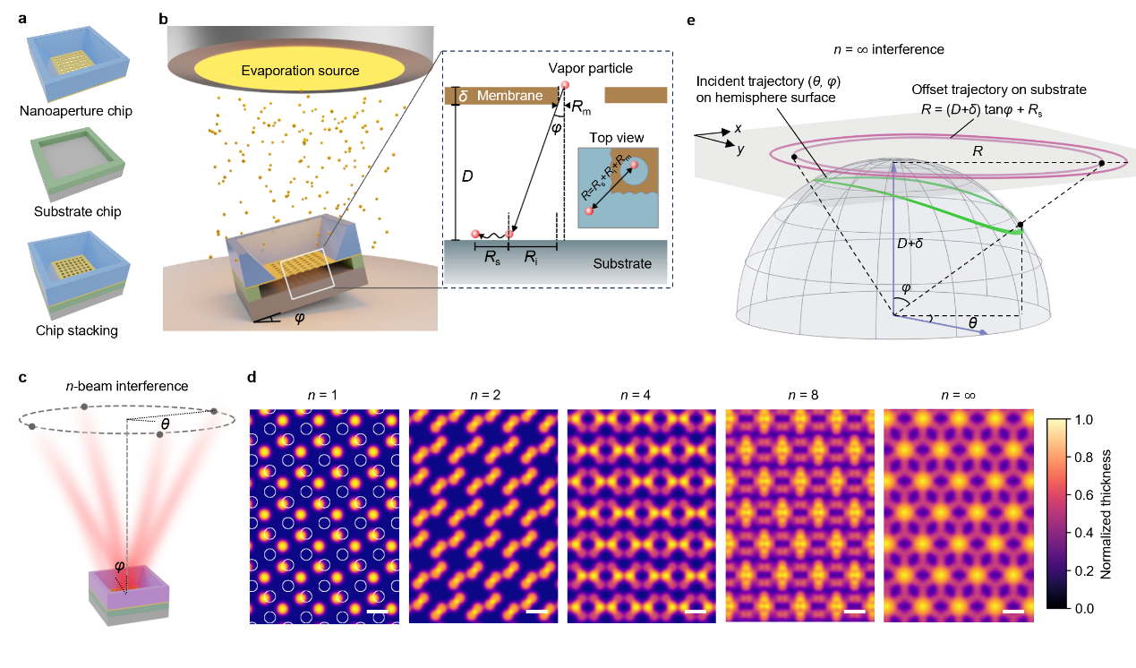 本研究提出一种基于分子束莫尔干涉效应的全新图案化策略,即 “分子束全息光刻技术”。该方法无需使用光刻胶,可对任意可蒸发材料(包括金属、氧化物和有机半导体等)直接形成高分辨率纳米图案,并可适用于复杂三维表面和超晶格结构的构建。其核心原理是通过精确控制材料束流穿过纳米掩膜时的投影角度,使其在衬底上形成类似于干涉光刻中相干激光束干涉的图案,实现高精度自对准与纳米结构控制。