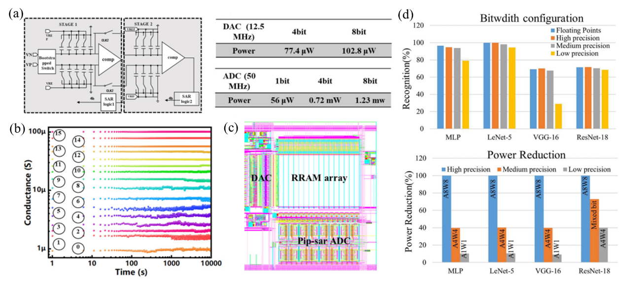 传统冯・诺依曼架构由于“功耗墙”与“存储墙”不适合边缘AI应用,存内计算(CIM)成为新选择,基于忆阻器的神经网络加速器受到广泛关注。但基于非易失性存储器的 DNN 存内加速器面临架构、电路和器件层面的挑战。采用岛式脉动阵列架构,以 PE 为基本单元灵活扩展,减少数据传输和延迟。设计 1/4/8 位流水线逐次逼近寄存器(PIP-SAR) ADC,根据神经网络层的位宽量化调整精度,降低功耗。利用脉动阵列计算时序,融合多个低精度忆阻器件存储 8 位权重,减少器件电导随机性非理想因素对精度的影响。