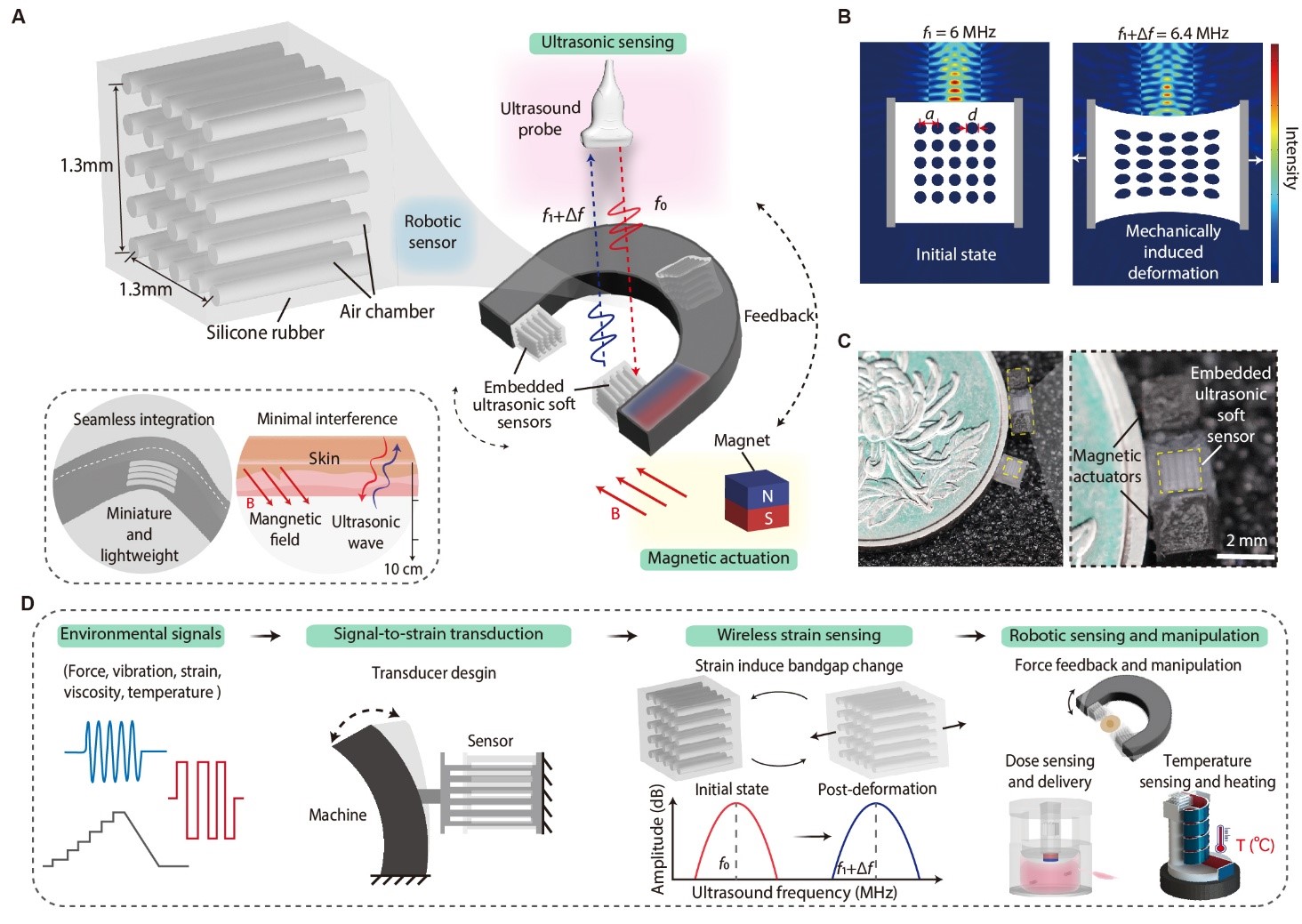 具备无线传感与操控能力的智能微型系统,被认为是推动生物医学应用的重要方向。但在毫米乃至更小尺度上,传感与驱动往往互相“打架”,使系统难以同时做到小型化、稳定和高性能。研究团队提出一种“机器人传感器”,将嵌入式超声软传感器(EUSS)与磁性执行器深度集成,突破小尺度传感—驱动不兼容瓶颈,构建无线传感与操控一体化的微型机器。EUSS与软/硬部件均兼容;依托机载换能器与无源超声通信,配合外部磁场,可对力、振动、黏度、温度等环境参量进行无线检测与调控,且不同物理场间干扰最低。在兔与猪模型中,系统完成基于频谱反馈的闭环操控,展示了精准剂量释放/给药与在位生理监测等关键能力。该研究为智能微型系统提供新的平台与工程路线,有望加速其在微创治疗与临床监测中的落地应用。