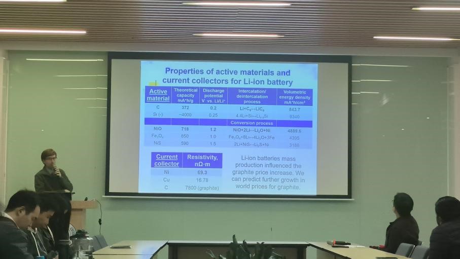 讲座主体聚焦非贵金属电极材料研发突破,Morozov博士系统阐释了其团队在提升电池技术能量密度、功率密度及安全可靠性方面的创新路径。针对镍微线作为电极骨架材料的独特优势,重点解析了三维网络结构的可控合成策略:通过枝晶状纤维生长调控与表面氧化工艺创新,成功开发具有多级纳米结构的无粘结剂Ni/NiO复合电极。该材料在锂离子电池阳极应用中展现出优异的电子-离子双通道传输特性,并初步测试了其在-10oC下的运行性能,具有较高的商业潜能。次外,其团队研发的PGNa-Ni20%生物基复合催化剂在析氢反应中实现商业铂碳催化剂83%的活性水平,引发与会师生热烈讨论。