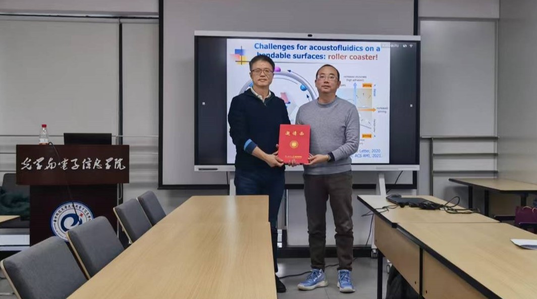在交流互动环节。傅永庆教授与在场的教师和学生展开了深入的交流和讨论,分享彼此的科研经验和心得。傅永庆教授对于智能材料与MEMS加工技术的深入研究,为在座的各位老师和同学提供了深刻的启发。罗为教授会后为傅永庆教授颁发了邀请函证书。