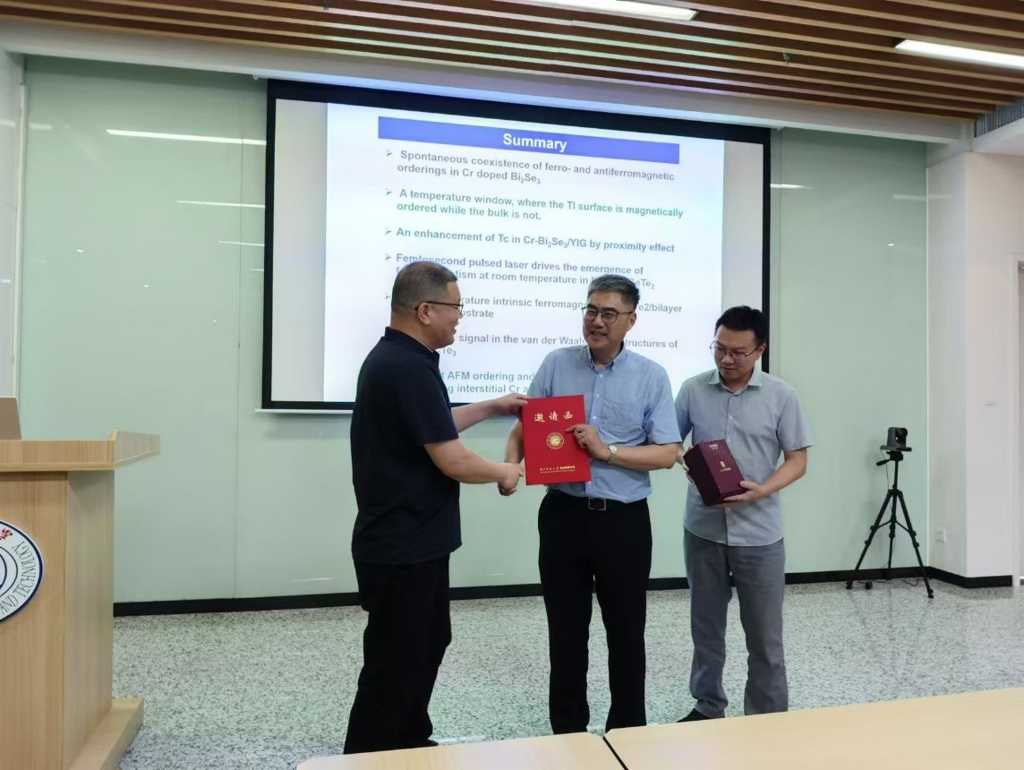 最后,在互动交流环节,在场的同学就自己的研究方向和对报告中有疑问的部分积极向徐教授提问,徐教授和同学们充分交流了飞秒脉冲激光操纵自旋有序性实验中的技术细节等问题,为同学们答疑解惑。游龙教授会后为徐永兵教授颁发了邀请证书。