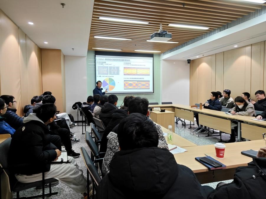 在讲座中,潘权教授围绕高速高性能信号链路研究,详细介绍了均衡器、时钟数据恢复电路和调制器等关键技术。他结合具体案例,探讨了如何实现低功耗设计,并提出一系列设计理念优化通信链路中的串扰问题。潘教授还分享了其团队的最新研究成果,引起了现场师生的浓厚兴趣。