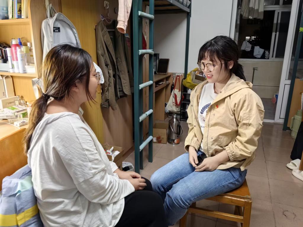 2023级辅导员刘文乐在走访中细致了解了同学们的思想状态、生活困难等情况,与入党申请人一起学党章、聊经典,并就入党程序等内容耐心答疑。鼓励同学们积极参与团支部、党章学习小组组织的学习活动,认真用好“青年大学习”、主题团日等学习机会,强化理想信念,筑牢信仰之基。2020级学生党员费靖、冯璐瑶等就保研升学、生涯规划等问题,细致解答新生的相关疑惑,建议大家重视专业课程学习,打牢专业基本功,关注赛事信息争取以赛促学,深入了解目标院校的学科特色,做好充分准备。