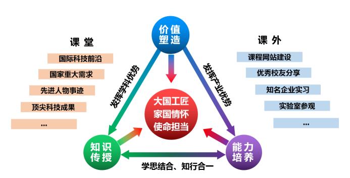 思政教育作为整个课程教学十分重要的一个环节,也受到了教学团队老师们的充分重视,并为其有效实施制定了基本框架。基于学习提高→元素收集→素材整理→课堂实践→学生反馈这五个环节,实现了一个高效的师生交流沟通的学习模式,并最终构建教与学的共同体。以学生为中心,将老师和学生紧密联系起来,形成老师带动学生、学生响应老师的良好学习氛围。基于半导体光电信息产业、学科优势的专业核心课程思政研究与实践探索,在姜胜林教授、罗风光教授、刘欢教授、张光祖教授、宋海胜教授、王鸣魁教授6位“半导体物理”课程教师的推动下,教学团队采用多种方法,多维度地将课程思政元素融入课程,实现二者的无缝对接。主要归纳为四个方面:第一,通过在半导体物理课程的知识点中发掘思政元素,多个知识点协同开发,达到以点带面的效果;第二,从我国集成电路产业等目前亟待解决的难题出发,在本课程的教学内容中寻找突破口,从而将本门课程从单一的理论性课程发展为理论与国家发展的现实性相结合的课程;第三,将哲学问题引入课堂,鼓励学生积极发言探讨,激发学生的学习兴趣;第四,通过介绍我国半导体行业的发展简史以及半导体领域大师的成长经历,增加学生的使命感和责任感 。
