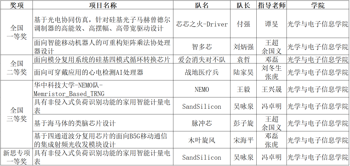 中国研究生创“芯”大赛是“中国研究生创新实践系列大赛”主题赛事之一,大赛由教育部学位管理与研究生教育司的指导,教育部学位与研究生教育发展中心、中国科协青少年中心主办,旨在服务国家集成电路产业发展战略,切实提高研究生的创新能力和实践能力,促进集成电路领域优秀人才的培养。自4月份大赛启动以来,我校研究生院和学生工作部研究生工作办公室高度重视研究生创新系列赛事的组织工作,在光学与电子信息学院的支持下,我校连续三年全国总决赛入围队伍全国第三,今年更是斩获全国一等奖2项,取得新突破。