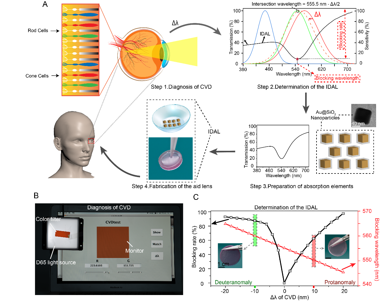 色彩视觉是人类最重要的感知能力之一。然而地球上有3亿多人都患有色觉缺陷(色弱和色盲)相关的疾病。虽然目前还没有根治这种疾病的临床方法,但有一些特殊的滤色眼镜/镜片可以被用于色觉缺陷的矫正。通过团队自己搭建的色盲鉴别镜,我们可以像测量近视度数一样,精确地测量色盲患者的类别和严重程度。并根据患者的色盲情况,反向设计出具备合适参数(峰值吸光率,滤波波长)的色弱矫正隐形眼镜。这种精确矫正的隐形眼镜不但能提高患者对不同颜色的辨别能力,而且能给患者还原一个近似正常人的色觉体验(图1)。绝大多数患者在佩戴反向设计矫正眼镜后,对石原氏图的辨别能力有了明显的提升。并且反映对其他日常生活中的场景的颜色感知,如:红绿灯,彩色气球等都有了一定的提升。