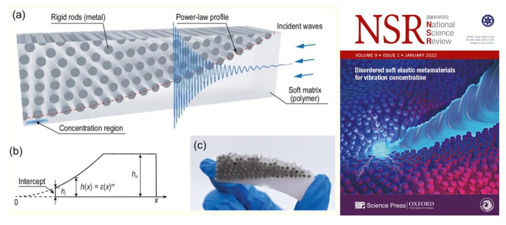 在声学超构材料领域,臧剑锋教授团队在《国家科学评论》(National Science Review, NSR)发表研究论文,提出可以利用无序超均匀图案分布构建内部声子带隙反射界面,来逼近理论上的完美声学黑洞,从而设计出了柔性的无序超均匀弹性超构材料(Disordered Hyperuniform Elastic Metamaterials,DHEM),在宽频范围内拥有约4000倍的振动聚集增强效果。在一定程度变形条件下,这种柔性无序超均匀弹性超构材料仍能保持良好的振动集中效果。柔性无序超均匀弹性超构材料的设计和实现拓宽了超材料的具体应用场景,为进一步高效利用自然界中的振动能量、增强对微弱振动的感知奠定了坚实的基础。相关工作以2022年第一期封面文章的形式发表在National Science Review, 2022, 9, nwab133.(https://doi.org/10.1093/nsr/nwab133)。