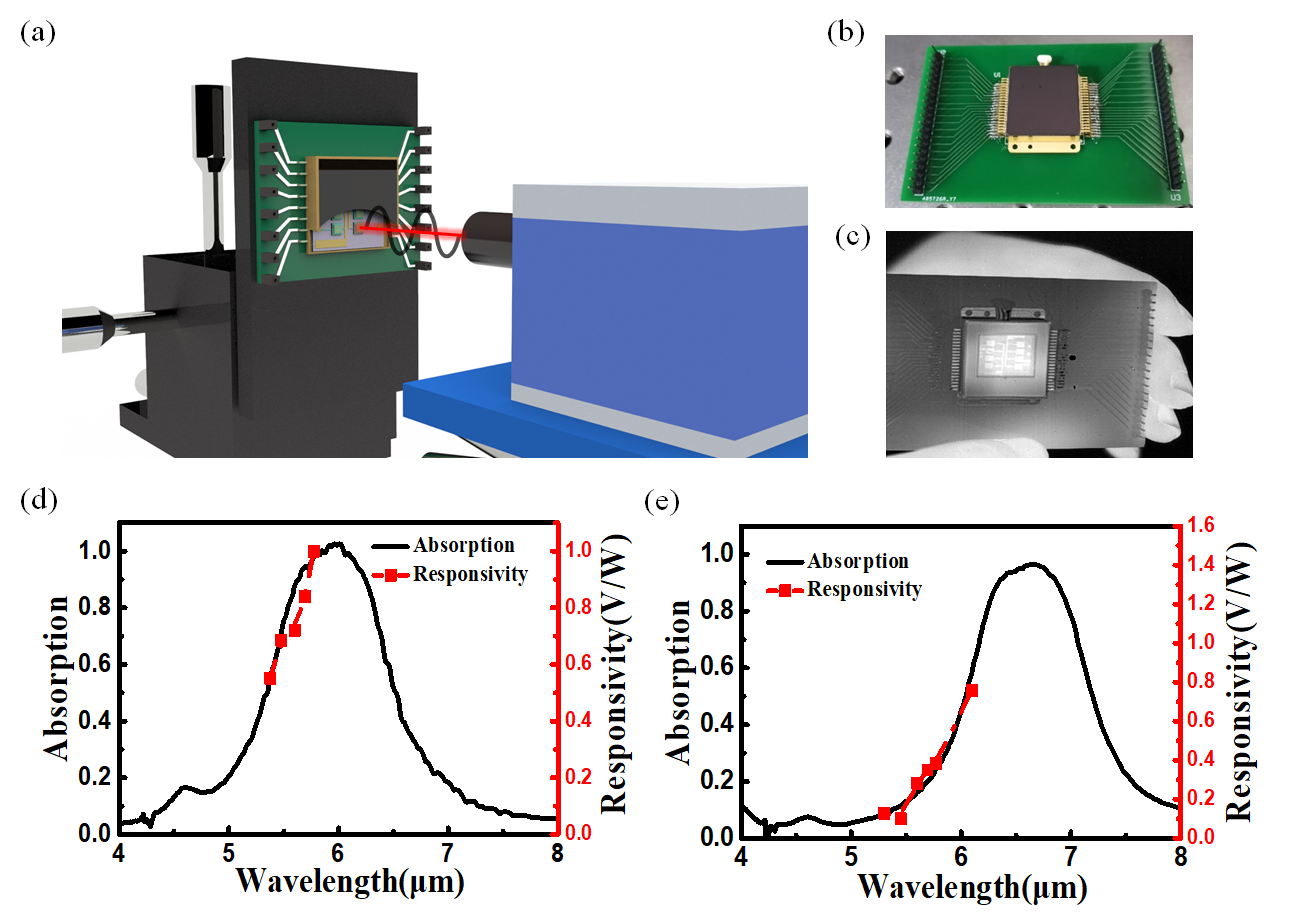 接下来开展了该超表面吸收体与传统微测辐射热计像元的工艺集成,主要工艺步骤如图2(a)所示。主要使用到的工艺为镀膜(电子束蒸发、PECVD、离子束溅射等)、刻蚀(ICP等)、图形化(光刻、电子束曝光等)。其中关键的热敏层材料由武汉光电国家研究中心赖建军教授团队协助制备。图2(b)显示了制备好的像元的SEM图和金相显微镜照片。图2(c)为8个像元的电阻随温度的变化特性,其中电阻温度系数都大约为-0.012。