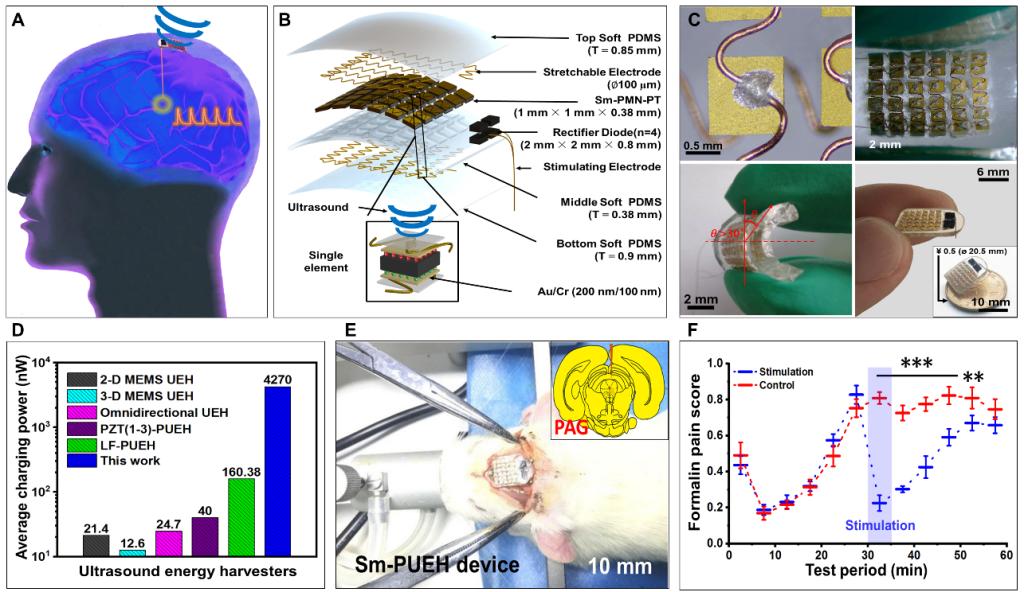 图1 (A)Sm-PUEH器件的潜在应用;(B)Sm-PUEH器件的构成;(C)制备后的Sm-PUEH器件;(D)器件的突出电学性能;(E)器件 体内植入;(F)超声驱动的Sm-PUEH器件实现深部脑刺激并达到疼痛抑制作用