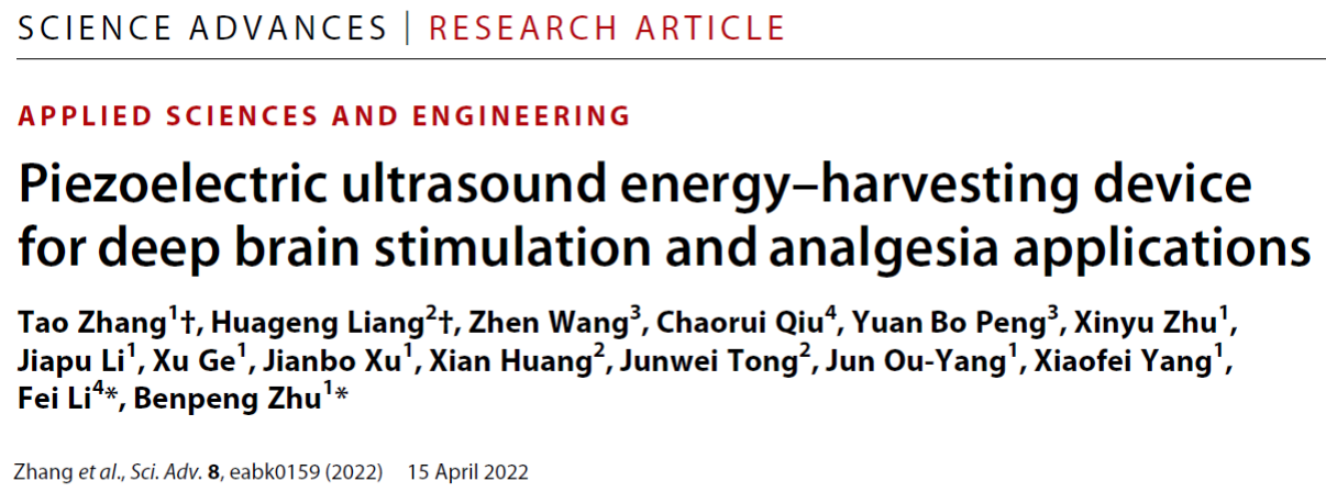 4月15日,我院杨晓非、朱本鹏团队联合西安交通大学电子与信息学院李飞教授、同济医学院梁华庚副教授和美国德克萨斯阿灵顿分校的Yuan Bo Peng教授在Science Advances上发表题为“Piezoelectric ultrasound energy–harvesting device for deep brain stimulation and analgesia applications”(面向深部脑刺激和镇疼应用的压电超声能量收集器件)的论文。论文利用高性能Sm掺杂PMN-PT压电单晶,设计并制备出6×6阵元、柔性植入式压电超声能量收集器件(Sm-PUEH);该器件在1MHz超声驱动下,可产生高达1.1 W/cm2的瞬时输出功率和4270±40 nW的平均充电功率,远高于之前的记录值(60 mW/cm2,160 nW);当Sm-PUEH被植入大鼠头部后,电生理与行为学实验结果表明,该器件可实现超声驱动的深脑电刺激,成功调节PAG脑区神经活动,并获得很好疼痛抑制效果。该研究为深脑刺激和疼痛抑制技术提供了新策略,并为生物医学植入式器件能源供给提供了新思路。
