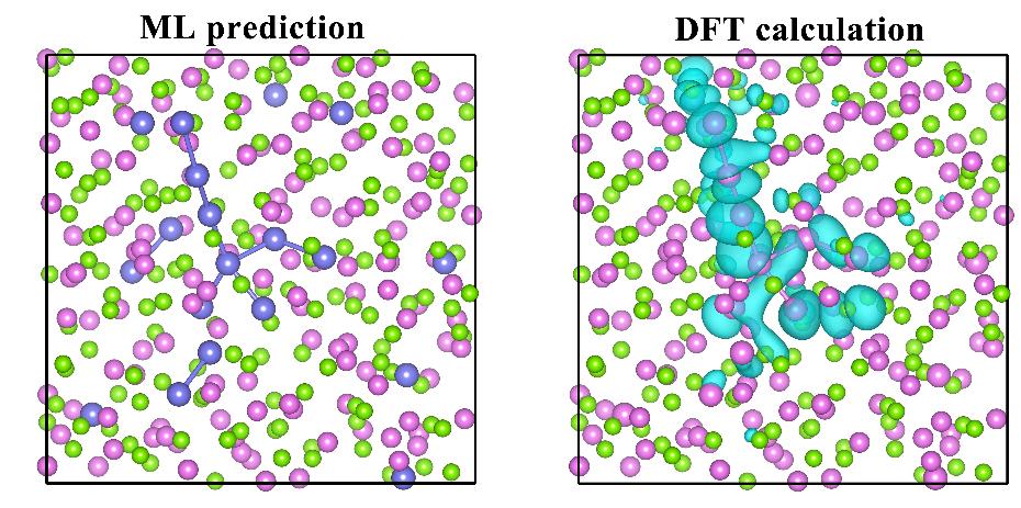 利用训练完成的MLP模型可以来预测新非晶态模型中的缺陷态。通过第一性原理计算建立新的非晶态模型,计算其中每个原子的局部结构特征作为输入, 然后通过MLP模型预测出了其中可能产生缺陷态的原子。其中大部分预测的可能原子形成了一个中程的团簇结构,因此改模型有非常大的概率会产生缺陷态。紧接着利用DFT计算证明了缺陷态的存在,同时将与缺陷态对应的波函数投影到非晶态模型中,发现与预测的团簇结构一致(见图3)。结果表明机器学习可以有效地预测缺陷态的存在并且确定相关的原子,这对于研究OTS材料的机理也具有重要意义。