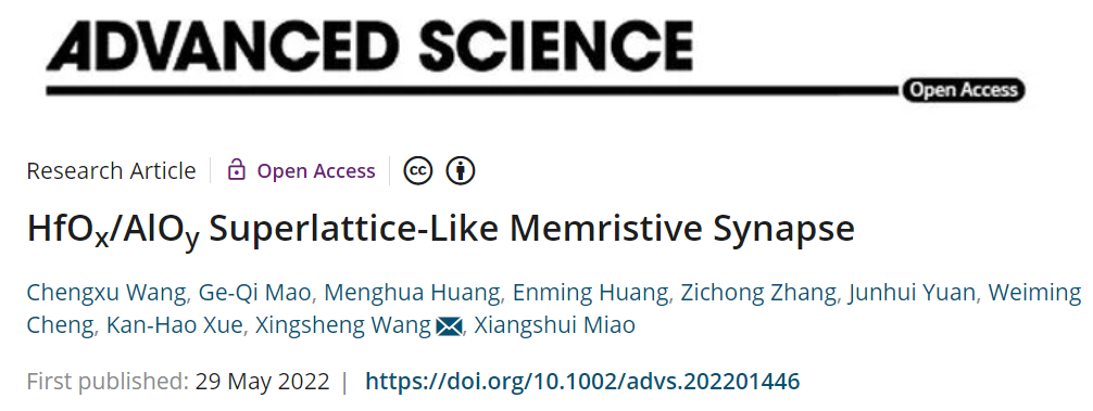 最近,全球著名综合性学术期刊《Advanced Science》刊发了我院王兴晟、缪向水教授团队在高性能忆阻突触器件研究中取得的最新成果,题为“HfOx/AlOySuperlattice-Like Memristive Synapse”,学校为论文第一和通讯单位,王兴晟教授为论文通讯作者,博士生王成旭和毛格齐为论文共同第一作者。这也是王兴晟教授课题组近两个月内在忆阻器领域连续发表的第二篇《Advanced Science》重要研究成果,期刊影响因子16.806。