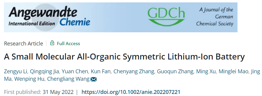 团队和南京大学的马晶教授团队合作,经过分子设计,引入多活性位点和调控分子间相互作用(氢键和π-π相互作用),合成了小分子电极材料2,3,7,8-四氨-1,4,6,9-四醌酚嗪(TAPT),在全有机对称锂离子电池中展现出了稳定的循环性能和较好的比容量、能量密度,优于已报道的全有机对称电池(Angew. Chem. Int. Ed. 2022, 10.1002/anie.202207221)。学院硕士研究生李增宇和南京大学博士研究生贾晴晴为论文共同第一作者,王成亮教授和马晶教授为论文共同通讯作者。