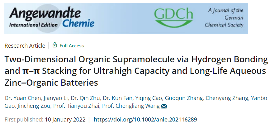 在小分子的基础上,进一步扩大共轭体系,利用氢键和π-π相互作用,抑制了材料的溶解,获得了目前容量最高的有机锌离子电池,可稳定循环10000次之上(Angew. Chem. Int. Ed. 2022, 10.1002/anie.202116289)。学院博士后陈远、本科生李健垚和南京大学博士后朱琴为论文共同第一作者,王成亮教授为论文通讯作者。