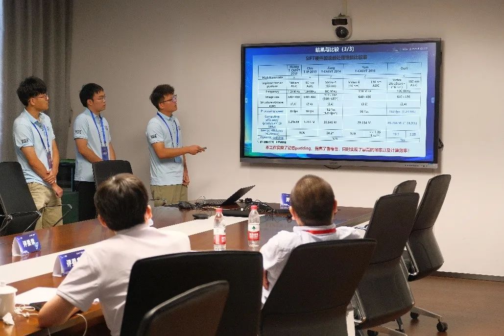 “智多芯Ultra”的答辩作品是“应用于无人驾驶的高帧率高鲁棒性特征提取加速芯片”,同样由王超老师和余国义老师指导参赛。该项目通过提出快慢时钟域,部分和复用及动态padding设计策略,极大的减小了运算量及资源开销。实现了一个可重构全流水线高斯金字塔生成加速器。通过提出一种新颖的基于圆域的描述符生成算法及全并行化设计方法,实现了一款高帧率、高鲁棒性、高计算效率的特征提取加速芯片。