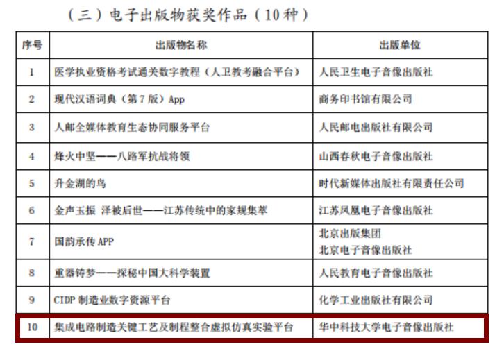 近日,由中国出版协会举办的第八届中华优秀出版物奖评选结果公示。基于我院国家集成电路产教融合创新平台的出版创新,由我院郝永德教授、刘卫忠副教授、陈实教授等参与主编的《集成电路制造关键工艺及制程整合虚拟仿真实验平台》获得电子出版物奖。