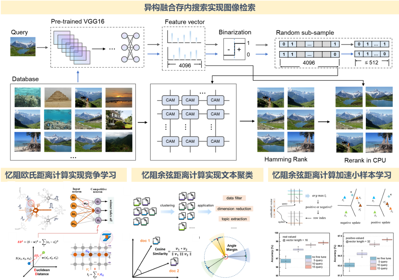 此项工作是李祎副教授、缪向水教授团队在存内搜索方向的阶段性研究成果。团队长期从事忆阻器及存内计算技术的相关研究,近年将存内计算思想引入相似性搜索驱动的机器学习,从器件、电路、架构、算法四个层次对存内搜索这一新兴技术开展了系统研究,在图像检索、类脑竞争学习、小样本学习等场景下进行了验证(图2),研究成果发表在IEEE Electron DeviceLetters、Advanced Intelligent Systems、Science China Information Sciences等期刊。