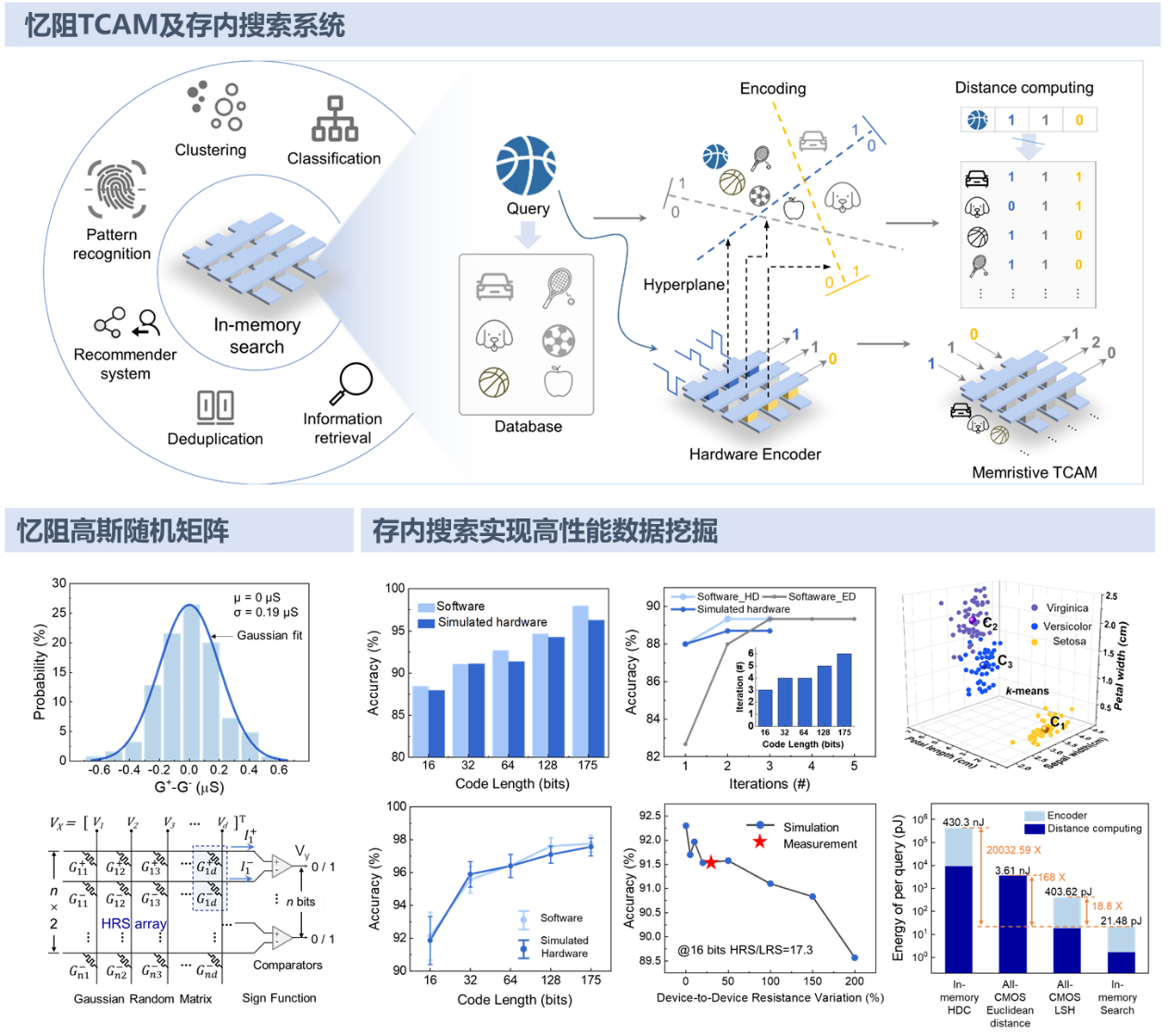 针对此问题,团队将忆阻存内计算(In-memory computing)的思想进一步发展聚焦,提出了存内搜索(In-memory search)的创新方案(图1),针对相似性搜索难题,首先提出利用忆阻器电导的本征随机性构造高斯随机矩阵的编码策略及编码硬件(Encoder),并基于忆阻器模拟计算能力设计构建高紧凑、低功耗的非易失三态内容可寻址存储器(nvTCAM),从而实现相似性搜索的两大核心流程—特征编码和相似度计算的原位并行执行。该方案将随机数产生器、矩阵运算单元、存储器三者的功能集成在同一忆阻电路中一步实现。此外,团队基于信息熵理论改进了经典局部敏感哈希算法,使得特征编码更加紧凑,降低了计算和存储开销。通过上述软硬件协同设计,忆阻存内搜索系统在分类、聚类等数据挖掘场景中能耗降低至CPU的1/168和专用集成电路(ASIC)的1/18.8。