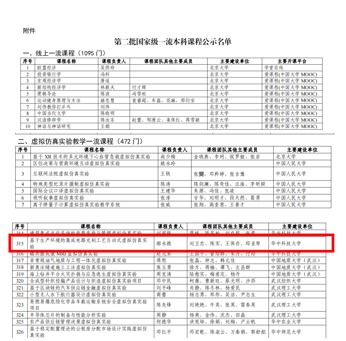 近期,第二批国家级一流本科课程公示,我院郝永德老师负责的《基于生产环境的集成电路光刻工艺互动式虚拟仿真实验》入选虚拟仿真实验教学一流课程。