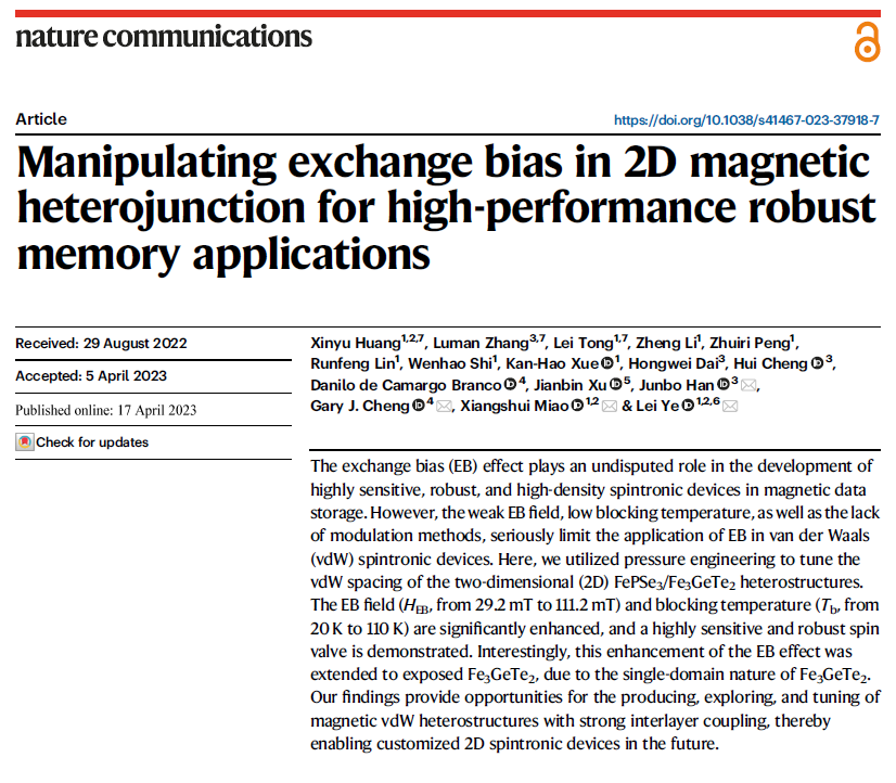 Huang, X., Zhang, L., Tong, L. et al. Manipulating exchange bias in 2D magnetic heterojunction for high-performance robust memory applications. Nat Commun 14, 2190 (2023).