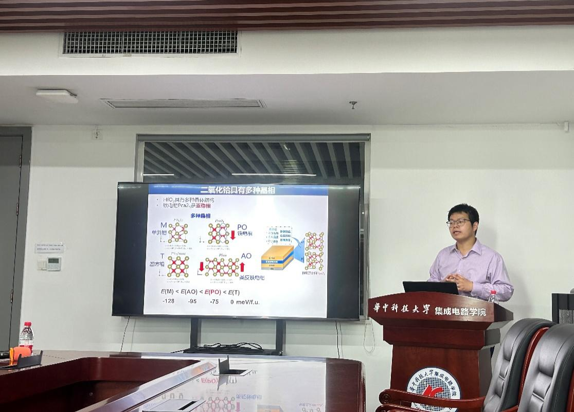 刘仕研究员首先介绍了铁电材料的用途,铁电材料及器件可用于压电驱动、铁电光伏、固态制冷、无创超声刀和废热发电等领域,并介绍了一种新型的铁电材料:二氧化铪(HfO2),这种新型的二元氧化物铁电材料与硅基工艺高度兼容,有望替代传统的钙钛矿型铁电材料。接着刘仕研究员介绍了近期课题组取得的一系列成果。通过第一性原理计算,发现铪基铁电具有独特的热释电效应,并发现HfO2具有新颖的“电致拉胀效应”。此外还谈到带电氧空位能够显著影响HfO2同一晶向不同构型间的稳定性,促进非铁电相向铁电相转变。最终建立了一个基于氧空位可变电荷的态的简单模型,能较好的解释薄膜制备中的多相共存、器件的唤醒效应、流性印记效应、惯性翻转等困扰铪基铁电的关键问题。在提问环节,刘仕研究员与在场老师和同学们就铪基铁电第一性原理计算进行了深入的交流和探讨。