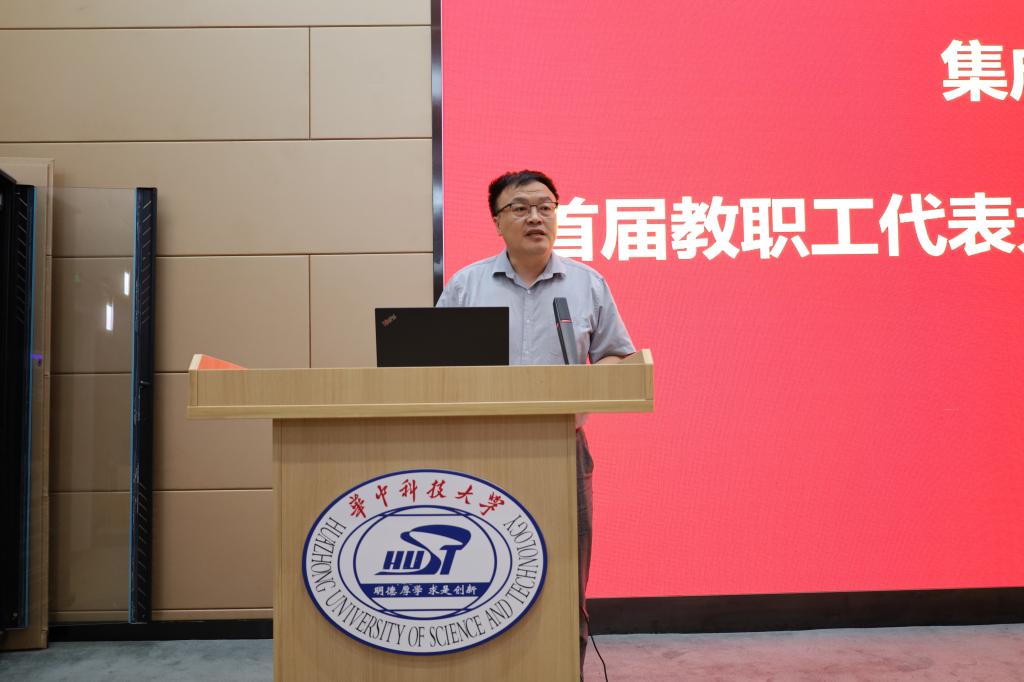 缪向水院长作学院发展规划报告。报告从平台建设、人才培养、科研进展、课程和学科建设等几个方面全面回顾总结了学院过去一年的工作和取得的成绩,谋划部署2023年工作思路和重点工作。构建高水平人才培养体系,锻造高素质人才队伍、加快科研创新步伐,增强服务经济社会能力,加大开放办学力度,提高对外交流合作实效,全力推进学院高质量发展。