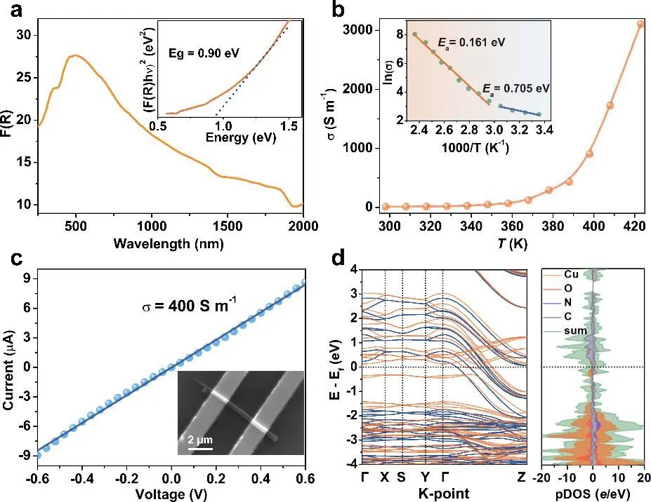 Cu-TAPT的漫反射光谱表明其光学带隙为0.90 eV,低于自由配体的光学带隙,与类似具有高导电性CCPs的带隙接近。在298-423 K的温度区间,对粉末压片样品进行变温导电率的测试,随着温度的升高,材料的导电率逐渐增大,在423 K时其导电率高达3100 S m-1。得益于高质量单颗晶体样品的获得,团队利用电子束刻蚀的方法(EBL)构筑了单晶器件,并测得Cu-TAPT单晶样品具有优异的导电性(~400 S m-1)。