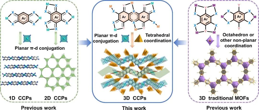 共轭配位聚合物(CCPs)作为一种独特的金属有机框架(MOFs)材料,可以通过有机配体的π轨道与金属离子的d轨道杂化耦合,产生一个高度离域的电子体系,同时增强分子内共轭,具有良好的电子导电率和稳定性。但是到目前为止,只有一维(1D)或二维(2D)的共轭配位聚合物被报道(图1)。长程共轭暗含了平面性,意味着构建三维(3D)共轭聚合物的巨大挑战。更重要的是,由于共轭配体以及d-π共轭,材料制备时配体和金属离子可能存在不同的化学态,共轭配位聚合物很难获得高质量晶体,化学结构还不是很清楚,缺乏准确的结构信息(配位结构、金属价态、活性位点等),也为研究材料的导电性以及应用带来了极大的困难。