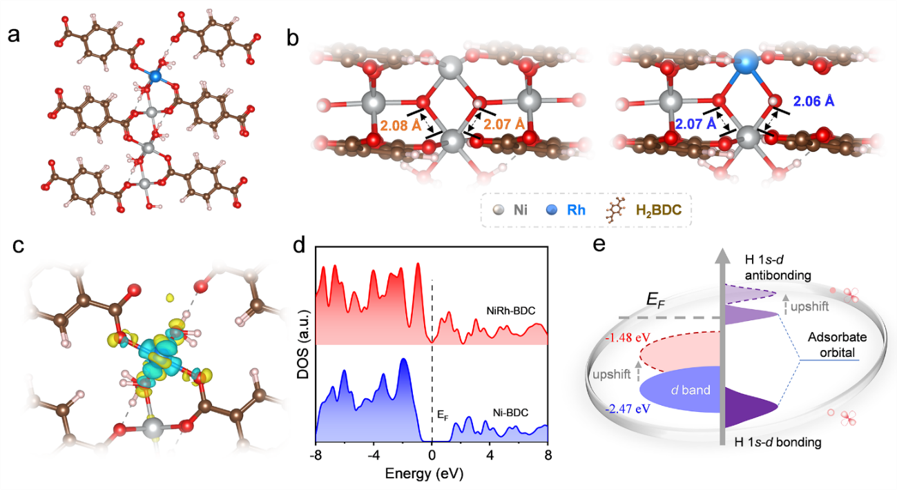 图2. (a) NiRh-BDC优化结构的顶视图。(b) Ni-BDC和NiRh-BDC优化结构的前视图,其中描绘了Ni-O键的键长。(c) NiRh-BDC局部电荷密度变化的等值面,其中黄色表示电子积累,蓝色表示电子耗尽。(d) Ni-BDC和NiRh-BDC的DOS图。(e)用DOS示意图说明d带中心的位置对H*与催化剂之间相互作用的影响。