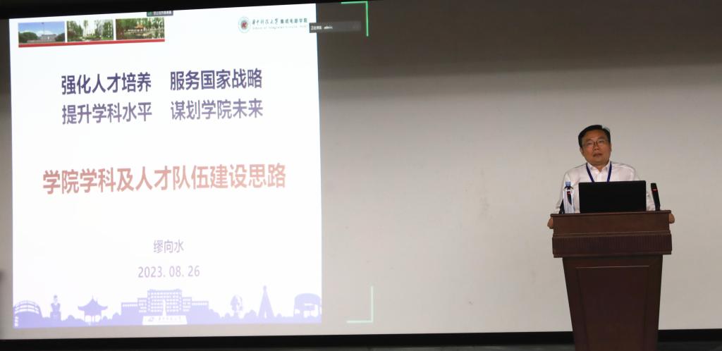 缪向水院长作“强化人才培养,服务国家战略,提升学科水平,谋划学院未来,学院学科及人才队伍建设思路”专题报告。着重对照往年学科评估指标以及国内同类院校相关数据,逐项分析了学院学科发展的优势和劣势,面对学科发展的短板与不足,缪向水院长提出了“固强补弱凝方向,建强学科进一流”的基本思路,围绕国家教学成果奖、国家一流课程、教材、国家科技奖励培育四个方面详细分析了如何落实固强补弱,精准施策。缪向水院长深入全面分析了学院人才队伍的现状与面临的主要问题,提出了人才队伍建设的总体目标与具体指标及人才队伍建设基本思路。
