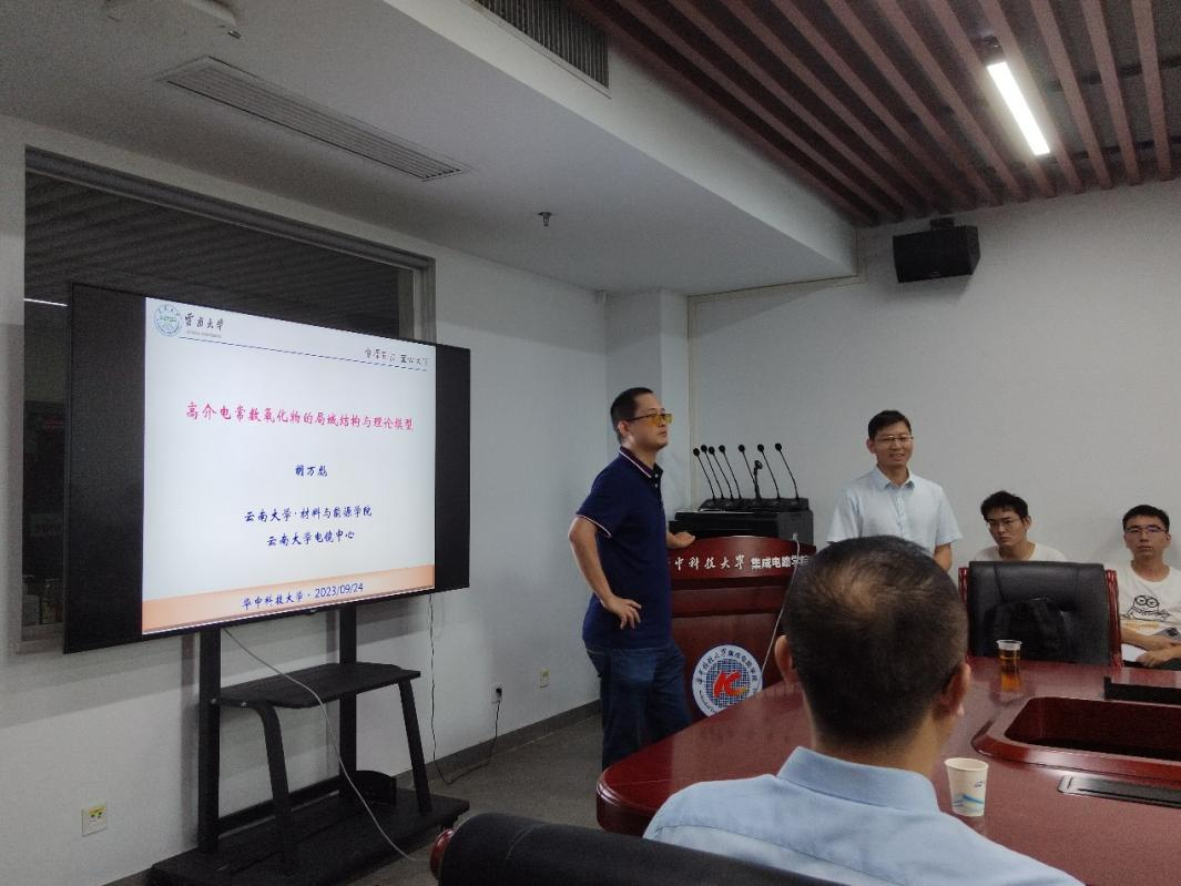 2023年9月24日,应我院董文副教授邀请,云南大学材料与能源学院副院长胡万彪教授做客 “喻园•育芯”讲坛。给我院师生带来题为《高介电常数氧化物的局域结构与理论模型》的报告。本院姜胜林教授、张光祖教授、李康华副教授等,武汉纺丝大学贺翀教授贺杜康副教授参与了此次交流会。