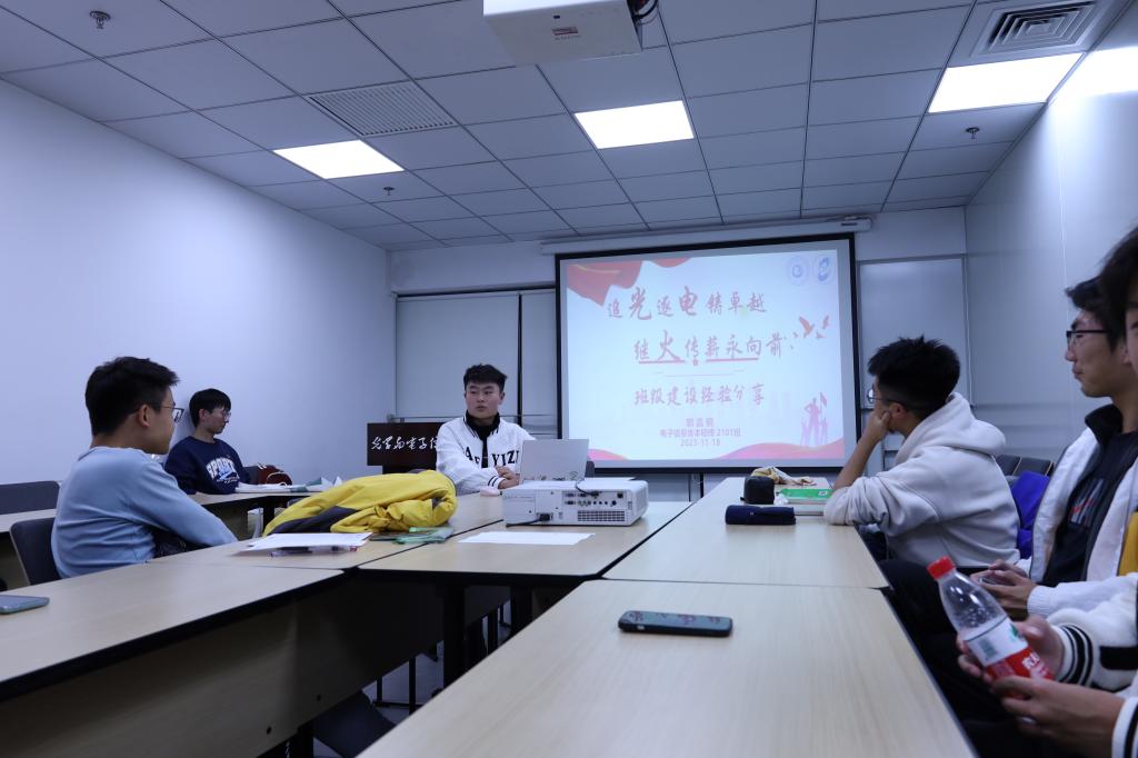 随后,来自21级本硕博班的郭嘉桐学长向大家分享了班级建设的经验,他以亲身经历为例,深入浅出地阐述了优秀班级建设的重要性和方法,从评选细则、荣誉班级建设内容以及经验总结三个方面出发,为电创2301班的未来发展指明了一条清晰的路线。