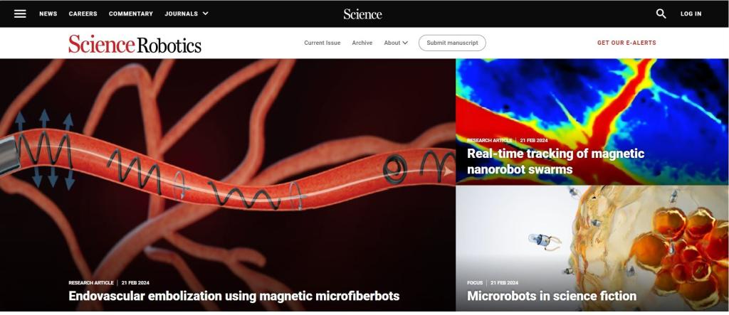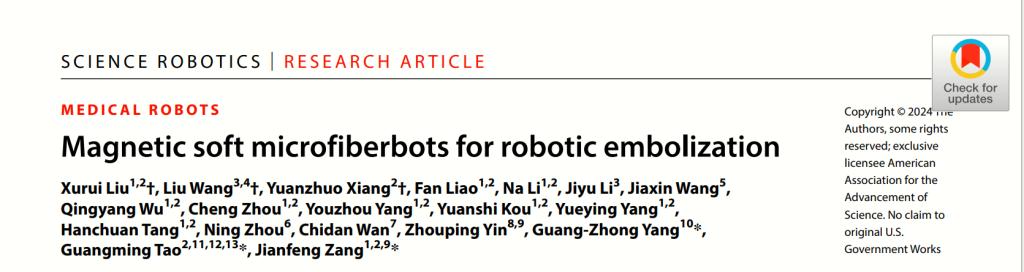 我院臧剑锋教授团队与陶光明教授、上海交通大学杨广中院士合作开发了一种磁性软微纤维机器人,用于执行远程控制的机器人化血管栓塞。该研究成果于2024年2月21日发表于《科学机器人》(Science Robotics),题为《用于机器人化血管栓塞的磁性柔性微纤维机器人》(Magnetic soft microfiberbots for robotic embolization)。