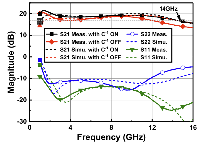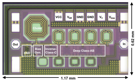 本文提出的宽带线性放大器结构,具备接近200%的相对带宽,同时通过组合不同线性的放大级,在保持高效率的同时提高线性度。分布式放大器的各个放大级分属于两种不同的增益单元(GC),分为深AB类GC和反相C类GC。本文所提出的反相C类GC可以对来自深AB类GC的信号在波谷附近进行补偿,从而显著提高DPA的谐波抑制性能,进一步地可节省互补放大器的功耗。通过将两种类型的GC集成到同一个分布式架构中,有效地补偿了由于晶体管截止频率较低而导致的带宽减少,从而显著拓展了PA的带宽。此外,本文还通过电流型偏置网络以防止放大器基极电流对产生偏置地电路产生潜在干扰,从而有效减小了偏置电流的波动范围,增强了DPA的稳定性。