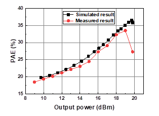 图5 PAE的仿真与测量结果