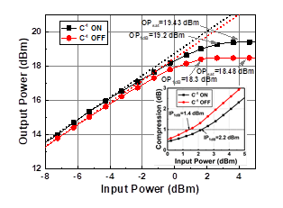 当反相C类GC开启时,6 GHz频段的2/3次谐波抑制提高了13 dB/6 dB,在13 dBm输出功率下,谐波抑制性能达到41.8 dBc/39.1 dBc。当反相C类GC开启时,输出1 dB压缩点提高1 dB,OP1dB为19.2 dBm;饱和输出功率提高0.9 dB,为19.43 dBm。在输出功率约为19 dBm时,峰值PAE为33.6%。与现有技术相比,所提出的DPA在实现宽带宽的同时,具有最高的峰值PAE、相邻通道功率比(ACPR)和2/3次谐波抑制比。