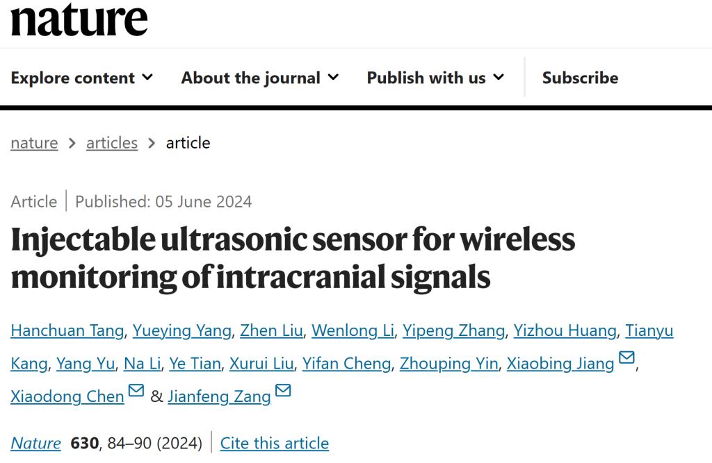 6月5日,国际顶尖期刊《自然》刊发了此项创新性医工交叉研究成果,题为“面向颅内生理监测的可注射超声传感器”(Injectable ultrasonic sensor for wirelessmonitoring of intracranial signals)。第一作者为williamhill中文博士后唐瀚川、博士生杨月莹,附属协和医院博士生刘祯;通讯作者为臧剑锋教授、新加坡南洋理工大学陈晓东教授、附属协和医院姜晓兵教授。williamhill中文为论文第一完成单位。