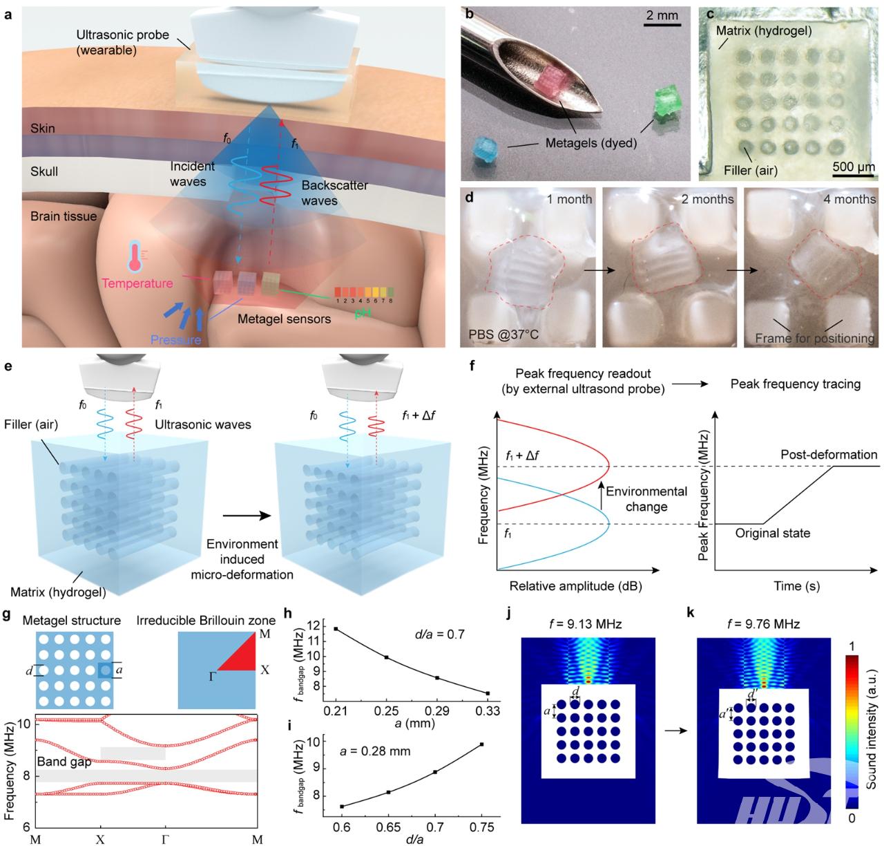 这种微型传感器的核心在于其独特的内部结构设计。研究人员在可降解水凝胶基质内部人工构筑了具有周期性排列的空气孔道结构。当外部环境如压力、温度、pH值等发生变化时,凝胶内部会产生微小形变,从而引起反射声波频率发生可测量的偏移。精确检测这种频率变化,即可获取颅内压力、温度、pH值以及血流流速等多种生理参数。他们还提出了一种创新算法,通过同步分析多个传感器的频率变化数据,可高效分离压力、温度、pH值等多种因素的耦合影响,从而实现对复杂生理环境的全面感知。