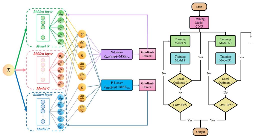 TCAD (Technology Computer Aided Design)是实现半导体器件设计与制造的关键环节。其通过对描述半导体器件行为的物理方程的求解,实现对器件各项参数的预测。传统的TCAD基于有限体积法、有限元法等方法,通过对有关物理方程的离散实现对器件的数值模拟。本文首次提出了一种基于物理感知神经网络(PINN)实现TCAD仿真的全新方法。该方法通过对所提出的基于径向基网络(RBFNN)模型改进的多阶微分神经网络(MDNN)模型的训练,在无需预先给出数据集的情况下,实现了对稳态情况下的泊松方程与漂移扩散方程的耦合求解。该论文在新型TCAD的函数定义、系统构造及求解方法上做出了崭新的贡献,这是目前首次实现的无需任何已有数据的机器学习TCAD仿真,从而在物理方程求解领域做出了新的尝试。对于PN结二极管示例而言,本方法能有效地仿真器件的基本物理特性,其自洽求解的误差小于1×10-5.