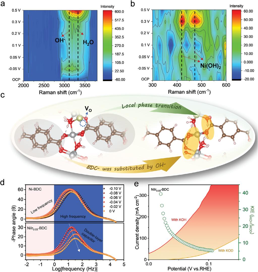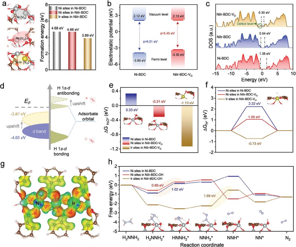 基于此,研究团队构建了一个定义明确的富VO的Ni基MOF催化剂(NiIr0.03-BDC),它对HzOR和HER都表现出优异的的电催化活性。具体而言,它在HzOR和HER过程中达到10 mA cm−2的电流密度所需的电位分别为−21和−27 mV,远优于原始Ni-BDC(HzOR电位为408 mV,HER过电位为−164 mV。原位拉曼光谱揭示,在HzOR过程中生成的VO促进了OH−在NiIr0.03-BDC表面的积累,从而导致Ni(OH)x活性物种的形成。原位电化学阻抗谱(EIS)和动力学同位素效应(KIEs)强调了OH−暴露对加速HzOR反应动力学的关键作用。此外,密度泛函理论计算阐明,Ir掺杂降低了带隙,而引入的VO带来了深层缺陷能级,从而增加了Ni-BDC的导电性。Ir掺杂后的电子结构调节使NiIr-BDC-VO的d带中心上移,有利于在HER过程中Ir位点上H2O*和H*反应中间体的吸附。对于HzOR,OH*反应中间体更倾向于吸附在NiIr-BDC-OH中静电势更高的Ni位点。