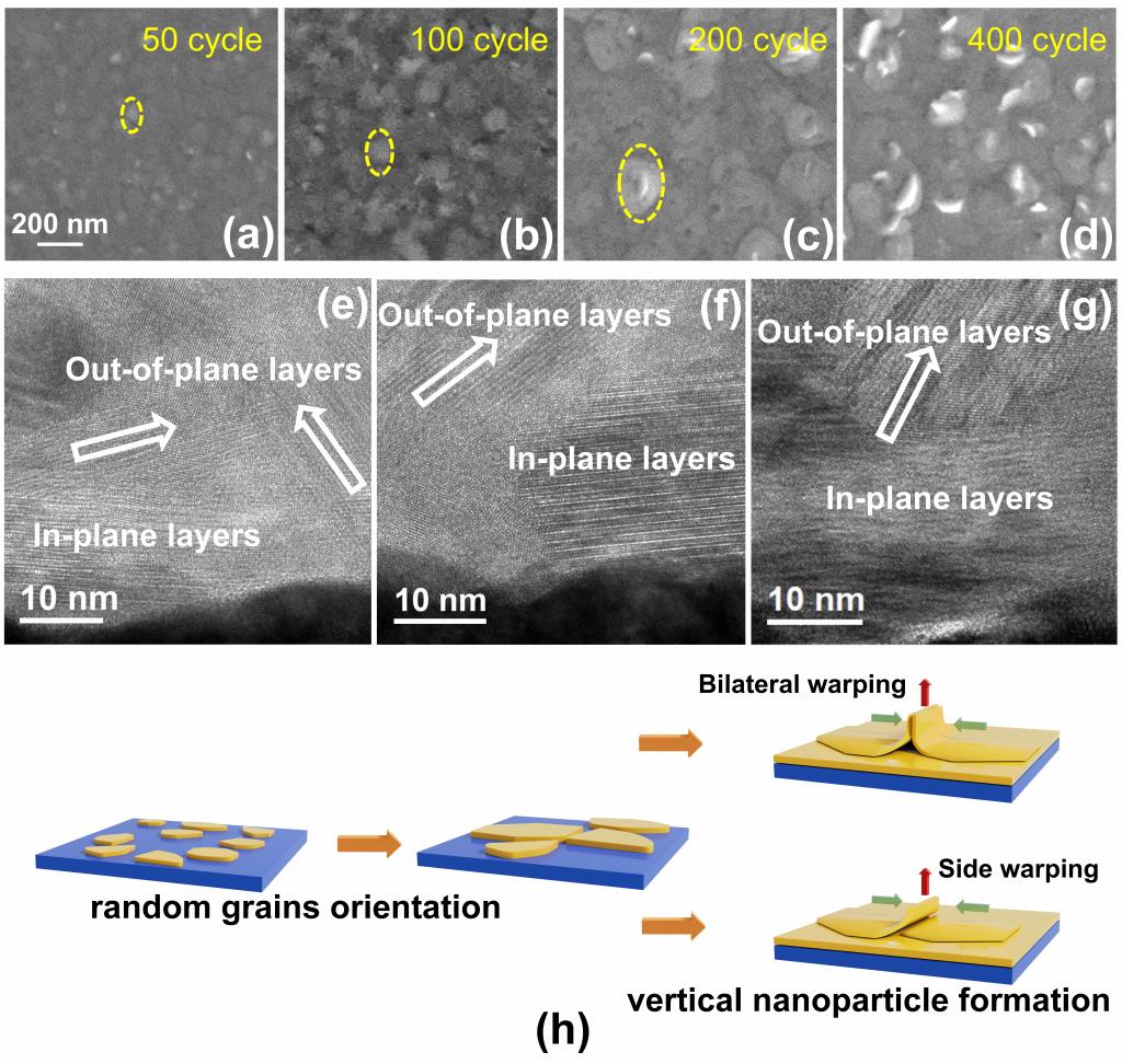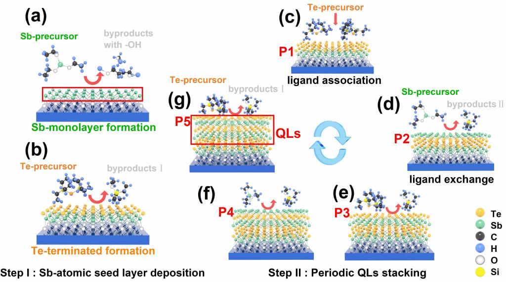 因此,研究团队创新性地提出低温原子层沉积技术,解决了Sb2Te3晶粒的随机取向和不规则垂直纳米颗粒结构叠加问题。该方法可获得具有高稳定性范德瓦尔斯间隙结构的Sb2Te3晶体薄膜,利用这些高织构Sb2Te3薄膜的诱导生长作用,在仅为90℃的低温下制备了具有择优晶体取向的超晶格薄膜。
