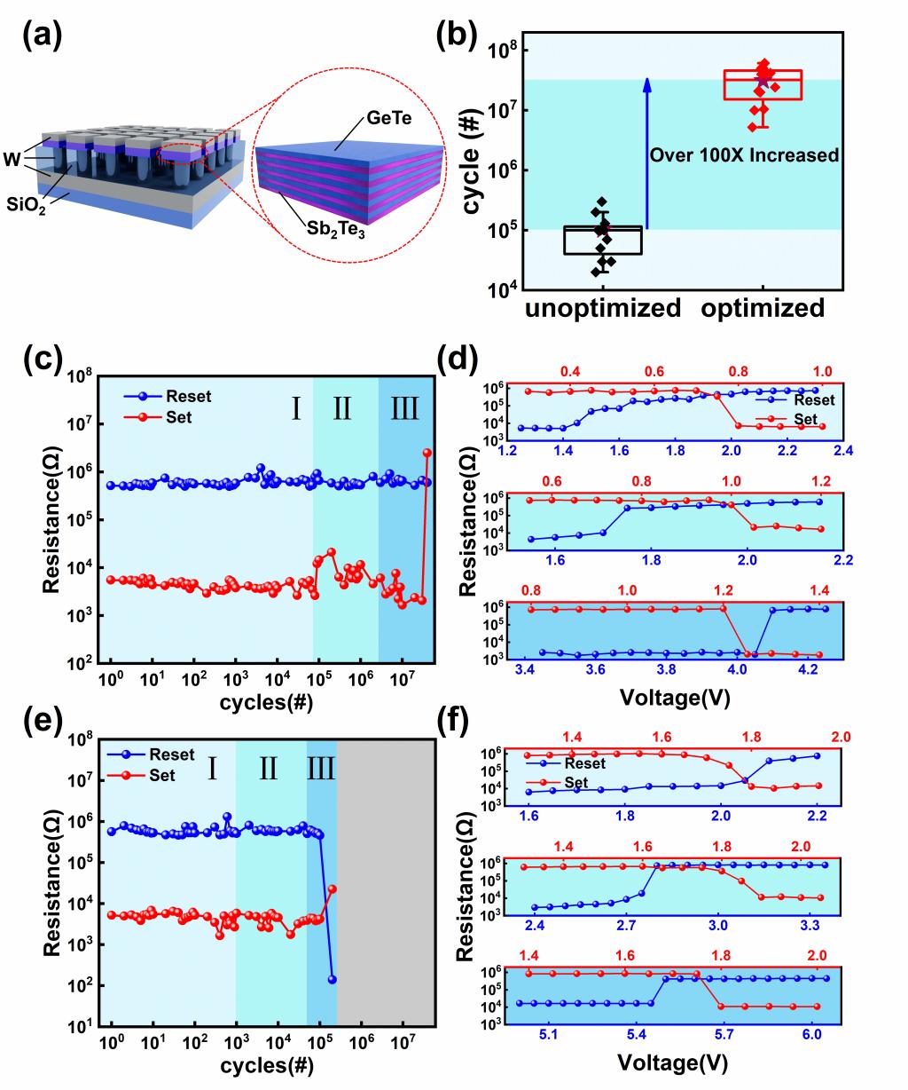 经过优化的超晶格薄膜在300℃退火后表现出显著的结构稳定性,并有效减缓了在电脉冲操作过程下合金相的出现,从而使器件的耐久性提高了100倍。该工作阐明了超晶格相变材料的界面混合(mix)机制,提出了基于新型低温ALD的超晶格相变材料沉积方案,解决了制约超晶格3D PCM产业化的循环/温度稳定性问题,为提升3D PCM在内存领域的竞争力提供了一种新思路。