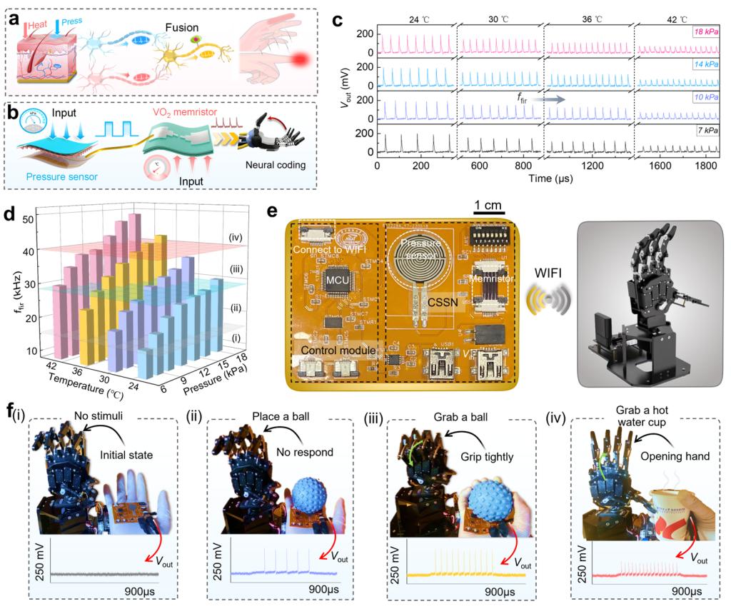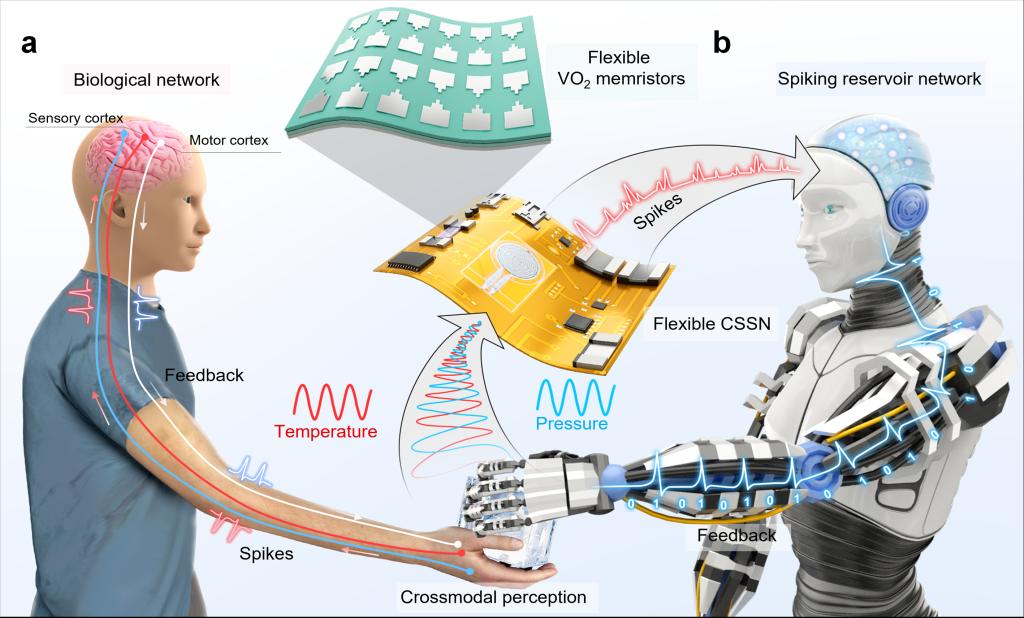 通过将柔性VO2忆阻器与柔性压力传感器耦合,构建了柔性跨模态感知神经元(CSSN),实现了对温度和压力信号的实时感知、编码和解码。基于CSSN,与机械手联动构建了柔性跨模态处理硬件系统,该系统不仅能够实时感知外界压力和温度变化,还能实时生成反馈信号,使机械手做出及时响应。将CSSN用于储备池网络,构建了一种跨模态脉冲储备池计算系统,实现了对动态物体的高精度识别(98.1%)和实时反馈,进一步验证了该神经元在复杂环境下的感内计算的准确性和可靠性。该研究为构建高效、低功耗的可穿戴人机交互系统提供了新的思路,有望广泛应用于智能穿戴设备、机器人技术以及其他多模态感知领域。