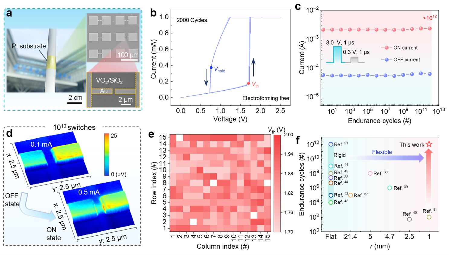 研究团队从相变材料VO2出发,通过引入Cr2O3缓冲层,在低温下(280℃)成功研制出性能卓越的柔性忆阻神经元器件,器件展现出超高的循环寿命(>1012)、出色的良率(97%)、高均一性(C2C:0.72%和D2D:3.73%)以及超快的响应速度(<30 ns),并且在多次弯曲下,器件依然保持优异的循环稳定性。