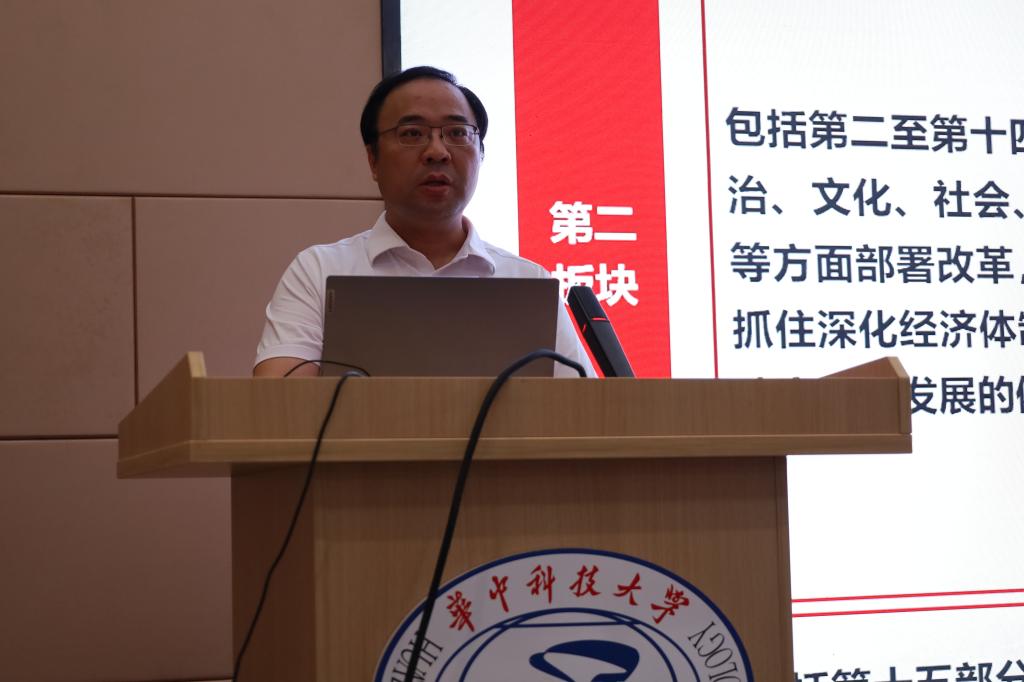 接下来,刘伟书记深入阐释了《决定》的精神实质和内涵要义。全会审议通过的《决定》深刻阐述了进一步全面深化改革、推进中国式现代化的重大意义和总体要求,深刻回答了进一步全面深化改革、推进中国式现代化的一系列方向性、根本性重大问题,擘画了以中国式现代化全面推进中华民族伟大复兴的战略举措。刘书记重点围绕《决定》的三大板块、15个部分、60条内容进行概括性介绍。他要求学院全体教职工应及时跟进学、全面深入学,深刻理解和把握《决定》提出的各项改革举措。
