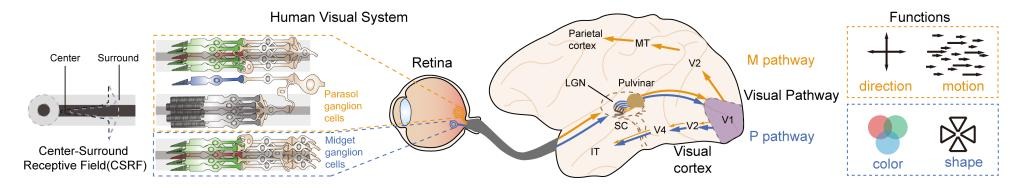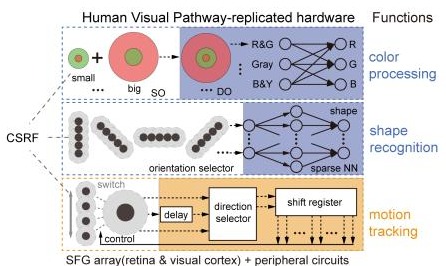 人类视觉系统包括视网膜、视觉皮层及其连接的视觉通路。腹侧通路(P pathway)和背侧通路(M pathway)分别通过特定的连接方式,进行颜色、形状识别的静态信息和方向、运动判断的动态信息处理(图1)。模仿视网膜在近年来研究广泛,但缺乏考虑视觉通路的连接方式,使得复杂视觉功能的集成化充满挑战。因此,本工作从人类视觉通路的连接状态出发,开发了一种复制视觉通路的多功能硬件。